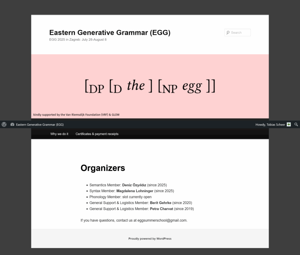 For more than 20 years, GLEE (Generative Linguistics in Eastern Europe), a Dutch-registered association, has organized the summer school EGG (Eastern Generative Grammar), each year in a different former communist country. The practical organization is done by a board that has four members. This has been the established structure of GLEE / EGG since the early 2000s.